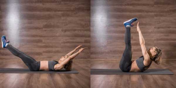 - Поднимите вверх обе ноги до угла в 45 градусов, вытяните носочки.