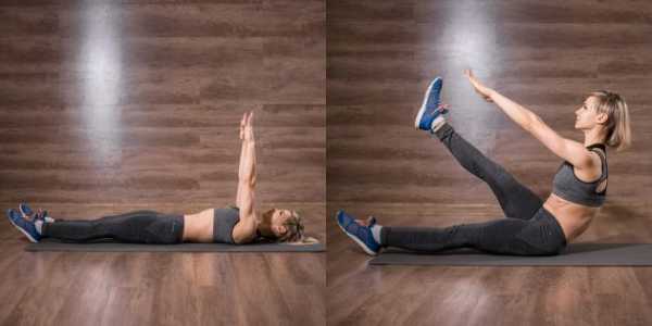 - Лягте на спину, поднимите прямые ноги и руки вверх, оторвите от пола верхнюю часть спины, тянитесь руками к стопам.