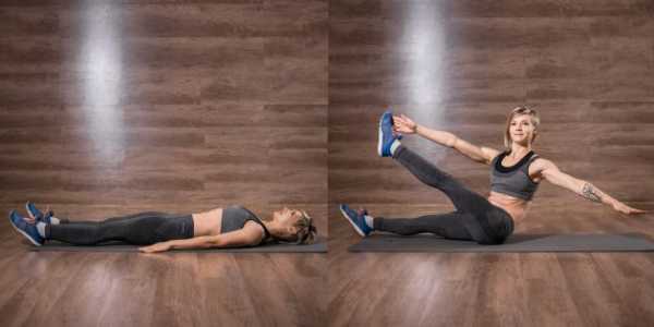 - Оторвите от пола плечи и таз, дотроньтесь кончиками пальцев до стоп.