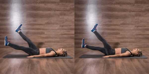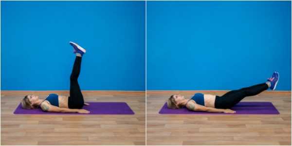- Прижмите поясницу к полу, медленно опустите обе ноги, затем так же медленно поднимите их. Чем медленнее вы двигаетесь, тем сложнее упражнение.
