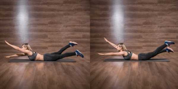 Лечь на живот, вытянуть руки вверх. Отрывая голову и плечи от коврика, одновременно тянуть вверх правую руку и левую ногу. Повторить левой рукой и правой ногой. Выполнять упражнение следует, попеременно меняя руки и ноги.