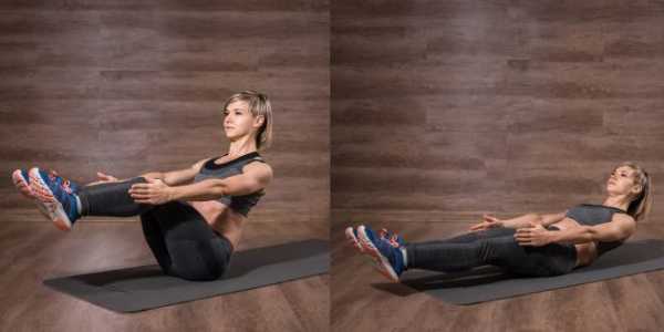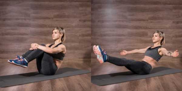 - Сядьте на пол, вес расположите на седалищных костях. Подайте назад спину, чтобы удержать равновесие, согните колени и оторвите от пола стопы.