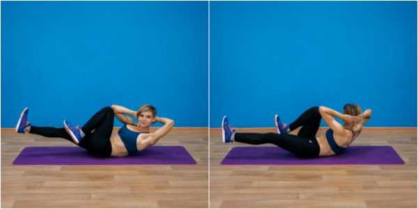 Выполнение. Лягте на пол, руки заведите за голову. Начинайте выполнять ногами такие движения, будто вы крутите педали велосипеда. При этом приподнимите верхнюю часть тела, стараясь оторвать лопатки от пола. Поочерёдно тянитесь правым локтем к левому колену, левым локтем к правому колену. Упражнение можно выполнять в любом темпе. Старайтесь не прижимать подбородок к груди и не тяните голову вверх руками. Не забывайте правильно дышать: выдох должен приходиться на каждое скручивание.