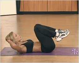 – лежа на спине. Руки держат за головой, ноги согнуты в коленях, носки приподняты. Не помогая руками, поднимают верхнюю часть тела на 2-3 см. При этом делают выдох. На вдохе ложатся обратно. Чтобы эффект от этого упражнения был максимальный, следует точно выполнять движения. Делают 8-10 повторов.