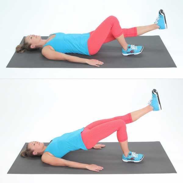 - Поднимите правое колено в направлении груди так, чтобы бедра оказались под углом 90° друг к другу. Не опускайте таз и спину вниз, когда будете поднимать и опускать ногу.