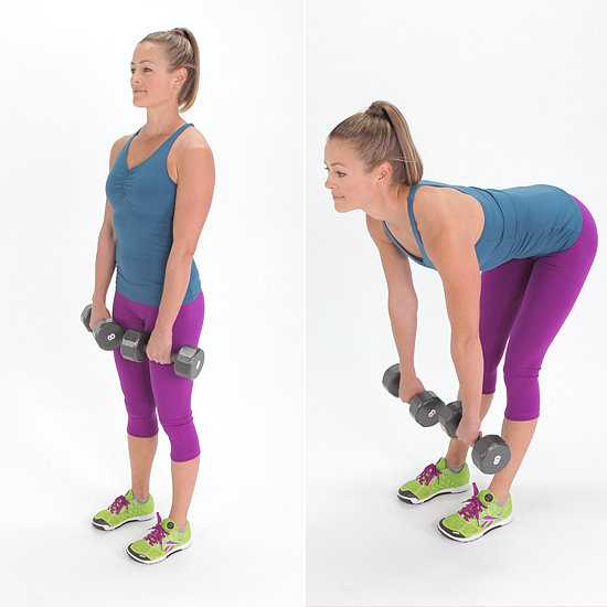 - Медленно наклонитесь, сгибаясь в области тазобедренного сустава, а не в области талии. Сохраняя спину в прямом положении, опускайте гантели как можно ниже.