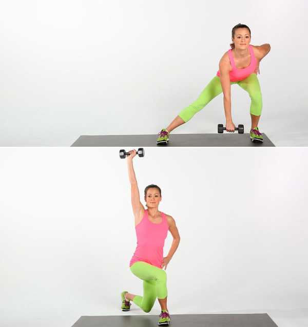 - Медленно разогните правую ногу и заведите ее за левую, как будто делаете реверанс. Гантели при этом выжмите вверх над головой. Обе стопы должны смотреть вперед.