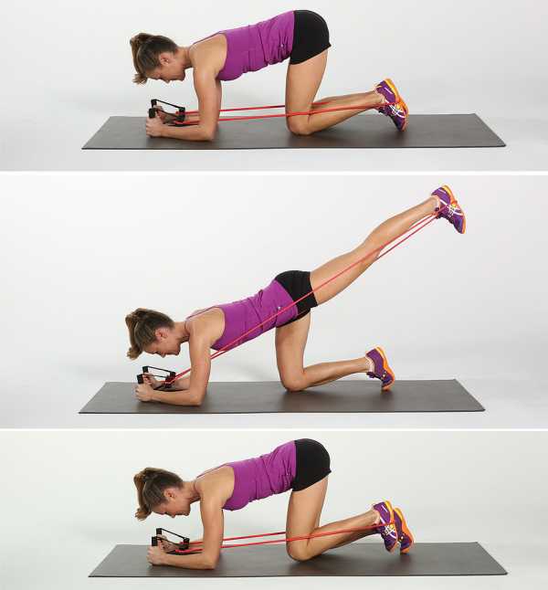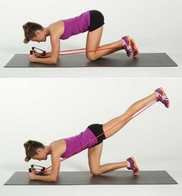 - Напрягите мышцы пресса. Крепко удерживая эспандер, разогните ногу назад. Затем согните ногу обратно, не касаясь при этом коленом пола.