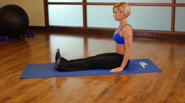 - Садимся на пол. Ноги вместе. Спина прямая, плечи немного отведены назад, подбородок приподнят. В таком положении нагрузка будет правильно распределяться на все группы мышц.
