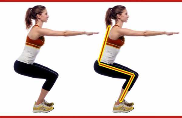 - Медленно сгибайте ноги в коленях, как будто собираетесь сесть на стул, при этом вес тела переместите на пятки. Следите за тем, чтобы колени не выступали дальше кончиков пальцев ног. Не двигайте колени в стороны или внутрь. Присядьте как можно ниже, не опуская при этом голову и грудь. Держите спину прямо, а плечи расслабьте. Не округляйте спину!