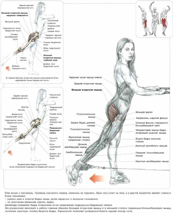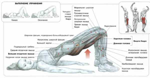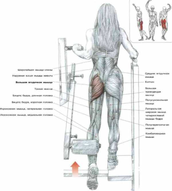 Упражнение хорошо нагружает и прорабатывает группу ягодичных мышц, а также заднюю поверхность бедра.
