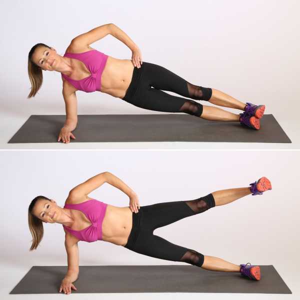 - Лягте на правый бок. Слегка оторвите корпус от пола, согнув правую руку в локте и зафиксировав на ней голову.