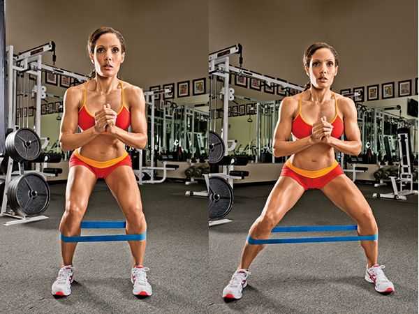 Для начала выполните серию приседаний. Это самые простые, но при этом крайне интенсивные движения. В особенности, если вы выполняете это упражнение, используя дополнительную нагрузку. Такая версия приседаний, при которой стопы стоят чуть шире плеч и носки развернуты в стороны на 45 градусов, прекрасно укрепляет ягодицы, стабилизаторы позвоночника, мышцы брюшного пресса и спины.