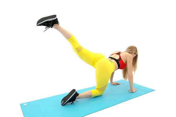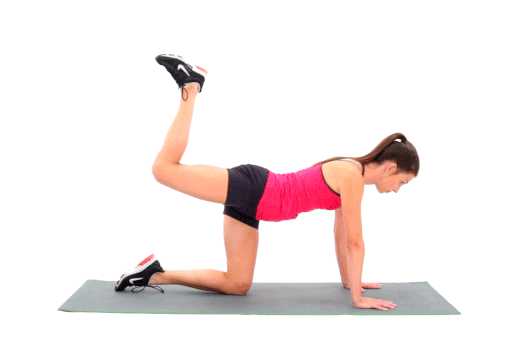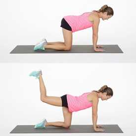 - Встаньте на четвереньки, поставьте ладони под плечами, а колени под бедрами. Сохраняя правую ногу в согнутом под углом 90° положении, поднимите ее до тех пор, пока она не станет параллельна полу.
