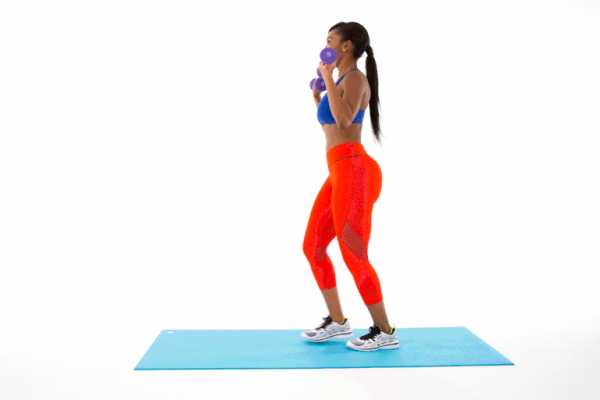 - Расставьте ноги на ширине бедер. Удерживайте гантели на уровне плеч, ладони при этом должны быть обращены внутрь.