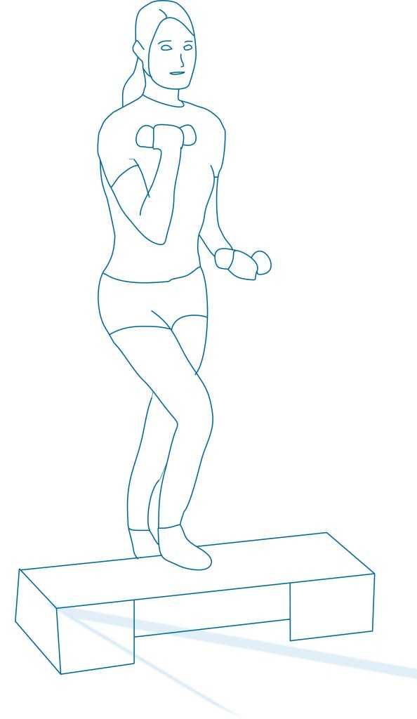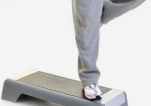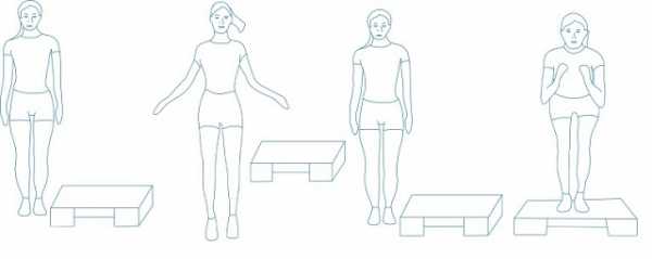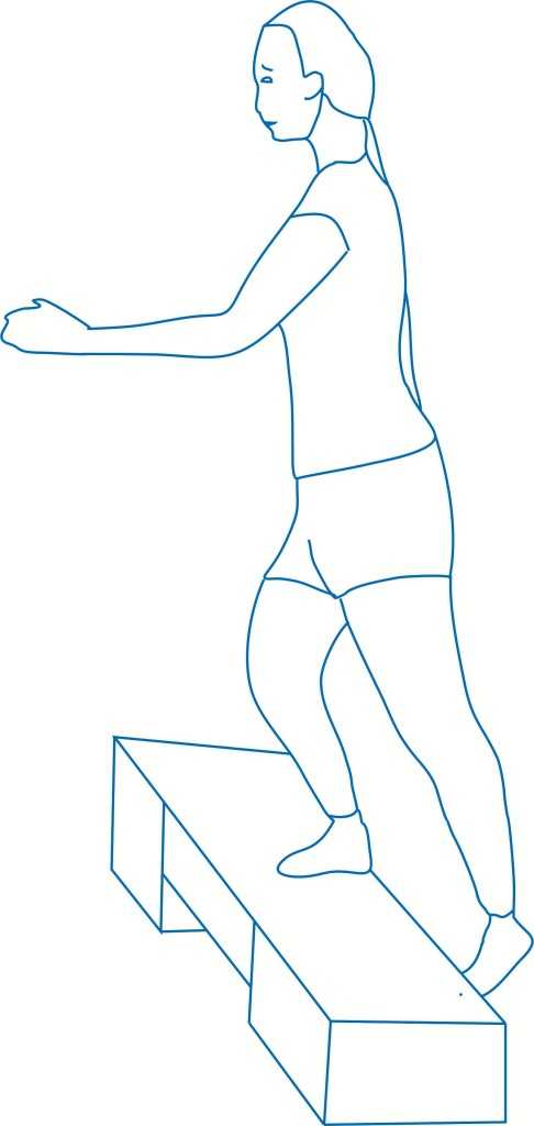 - Поставьте правую ногу на степ-платформу, затем левую ногу на носок и опустите сначала левую, потому – правую.