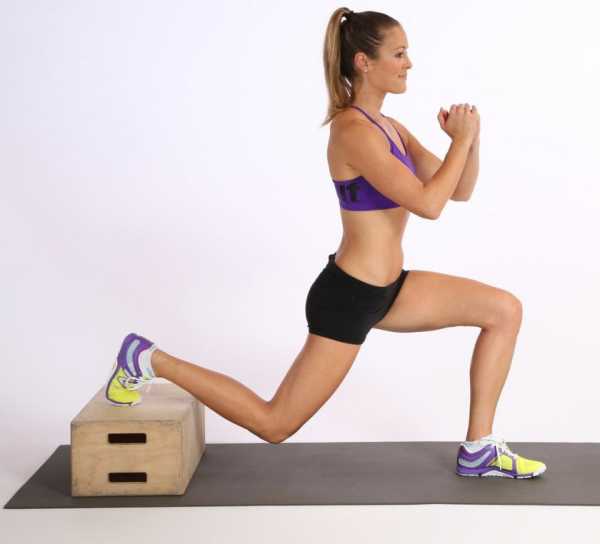 - Особый эффект наблюдается от выпадов. Ноги ставятся на ширине бедер, находясь в метре от спортивного инвентаря. Сначала делается один большой шаг, стопа ставится на опору, затем следует опуститься в выпад. В таком положении задняя часть колена должна оказаться под бедром, а угол его составляет 90 градусов. Движение повторяется с другой нижней конечностью.