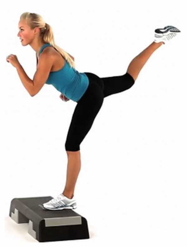 - Для проработки ягодичной мышцы нога ставится на опору, после перенесения веса на нее, вторая нижняя конечность поднимается назад.