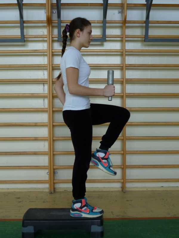 - Поставьте правую ногу на платформу, и колено правой ноги подтяните к животу. Для равновесия разрешается тело наклонить немного вперед.