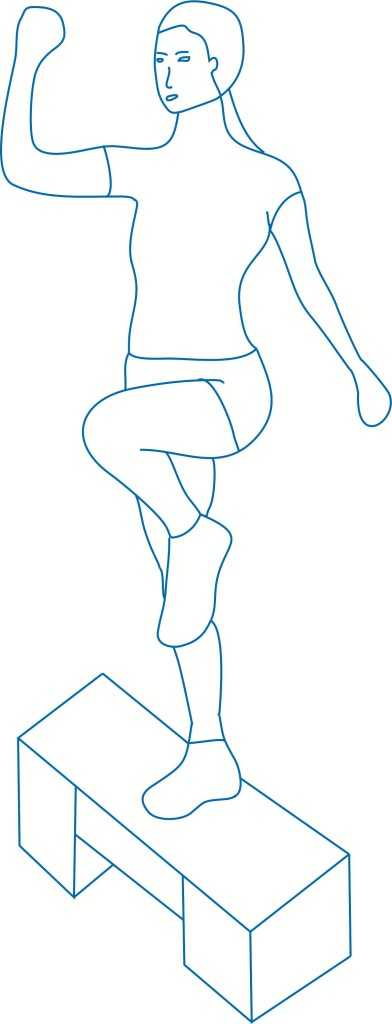 - Сделайте шаг левой ногой на платформу подняв левую руку к правому плечу затем опустите сначала ногу, потом – руку и повторите данное упражнение с правой ногой и правой рукой.