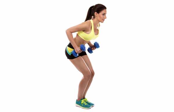 - Возьмите легкую гантель в каждую руку и согнитесь.
