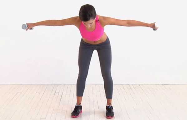 Возьмите в руки пару нетяжелых гантелей, встаньте прямо. Ноги поставьте на ширине плеч и немного согните их в коленях. Наклонитесь под углом 45 градусов. Не сгибая рук, плавно поднимайте их в стороны, ощущая напряжение в верхней части спины и плечах. Сделайте пару подходов по 12 повторений.