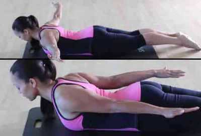 Сначала нужно лечь на живот, выпрямиться и вытянуть руки вперед, приняв позицию I. Лопатки сведите вместе, руки оторвите от пола примерно на 15 см. Задержите их в таком положении на 10 секунд, затем медленно опустите.
