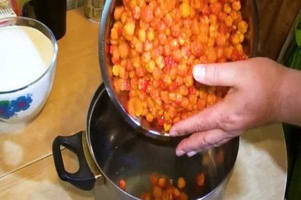 - Подготавливают морошку, закладывают в кастрюлю, добавляют воду.