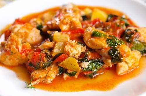 ΠΠ° Π΄Π½ΠΎ Π³ΠΎΡΡΠΎΡΠΊΠ° ΠΏΠΎΠ»ΠΎΠΆΠΈΡΠ΅ ΠΏΡΠ΅Π΄Π²Π°ΡΠΈΡΠ΅Π»ΡΠ½ΠΎ Π½Π°ΡΠ΅Π·Π°Π½Π½ΠΎΠ΅ Π½Π° ΠΊΡΡΠΎΡΠΊΠΈ, Π½Π°ΡΠΏΠΈΠ³ΠΎΠ²Π°Π½Π½ΠΎΠ΅ ΡΠ΅ΡΠ½ΠΎΠΊΠΎΠΌ ΠΈ ΡΠΌΠ°Π·Π°Π½Π½ΠΎΠ΅ ΡΠΎΠΌΠ°ΡΠ½ΠΎ-ΡΠΌΠ΅ΡΠ°Π½Π½ΡΠΌ ΡΠΎΡΡΠΎΠΌ ΠΌΡΡΠΎ ΠΊΡΠΎΠ»ΠΈΠΊΠ°. ΠΠΎΡΠΎΠ»ΠΈΡΠ΅, Π΄ΠΎΠ±Π°Π²ΠΈΠ² ΠΏΠ΅ΡΠ΅Ρ Π³ΠΎΡΠΎΡΠΊΠΎΠΌ ΠΈ Π»Π°Π²ΡΠΎΠ²ΡΠΉ Π»ΠΈΡΡ. Π‘Π²Π΅ΡΡ Ρ Π²ΡΠ»ΠΎΠΆΠΈΡΠ΅ Π½Π°ΡΠ΅Π·Π°Π½Π½ΡΠ΅ ΠΊΠΎΠ»ΡΡΠ°ΠΌΠΈ: ΠΏΠΎΠΌΠΈΠ΄ΠΎΡΡ, Π»ΡΠΊ, ΡΠ΅Π»ΡΠ΄Π΅ΡΠ΅ΠΉ ΠΈ ΠΌΠΎΡΠΊΠΎΠ²Ρ. ΠΠ°Π»ΠΈΠ² Π½Π° 2/3 Π²ΠΎΠ΄ΠΎΠΉ, ΠΎΡΠΏΡΠ°Π²ΡΡΠ΅ Π² Π΄ΡΡ ΠΎΠ²ΠΎΠΉ ΡΠΊΠ°Ρ Π½Π° 45 ΠΌΠΈΠ½ΡΡ.