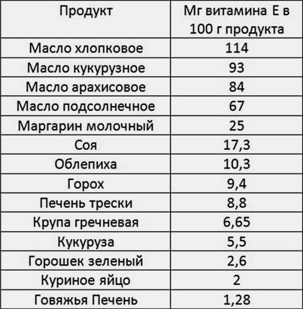 | Наименование продуктов | Содержание витамина Е на 100 г продукта (в мг) |