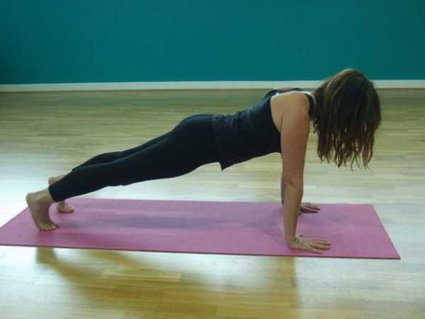 - Наклонитесь и поставьте прямые руки на коврик, так, чтобы между туловищем, ногами и руками были прямые или слегка тупые углы.