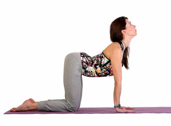 - Вместе с вдохом прогибайте позвоночник в противоположном направлении. Спина вогнутая и напоминает седло.