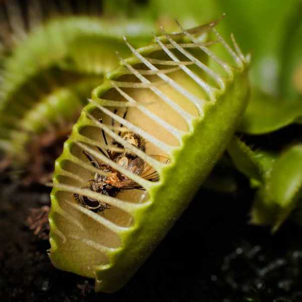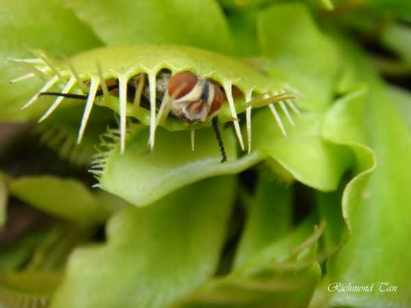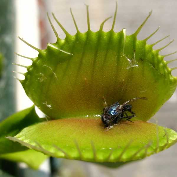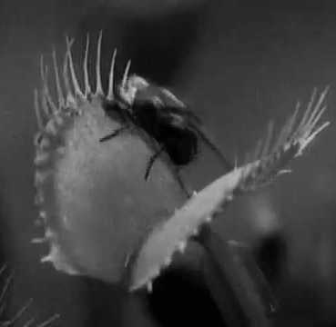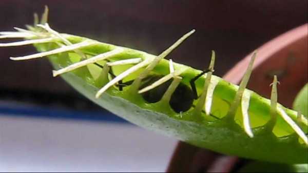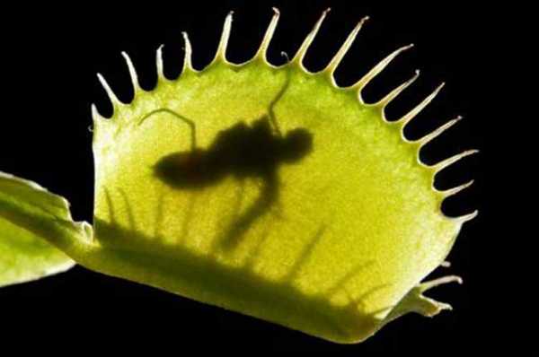 Цветок Венерина мухоловка с необыкновенной для растения скоростью захлопывает свои ярко окрашенные листья-ловушки, усеянные по краям острыми и длинными шипами. Мгновенная реакция происходит рефлекторно, лишь стоит жертве коснуться чувствительных волосков на поверхности. Захлопнувшийся плотный двустворчатый листок сразу превращается из ловушки в желудок мухоловки, где начинается переваривание очередной порции пищи.