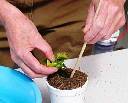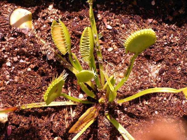 При выращивании венериной мухоловки не надо вносить в субстрат удобрения, так как она получает необходимые вещества из перевариваемых насекомых.