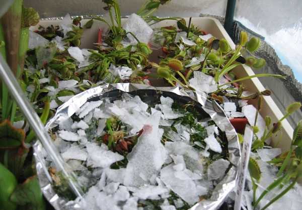 Зимовка дионеи мухоловки в застекленном помещенииТакже венерина мухоловка может зимовать в холодильнике, но только после подготовки. Емкость с растением надо обработать фунгицидом Топаз либо Максим, упаковать в пакет, сделать несколько небольших отверстий для поступления воздуха и поставить в холодильную камеру. Температура во внутренней камере аппарата должна варьироваться от 0 до 5ºС. В таких условиях мухоловка дионея может находиться без света. Субстрат следует увлажнять дистиллированной водой (5ºС). Весной его необходимо заменить.