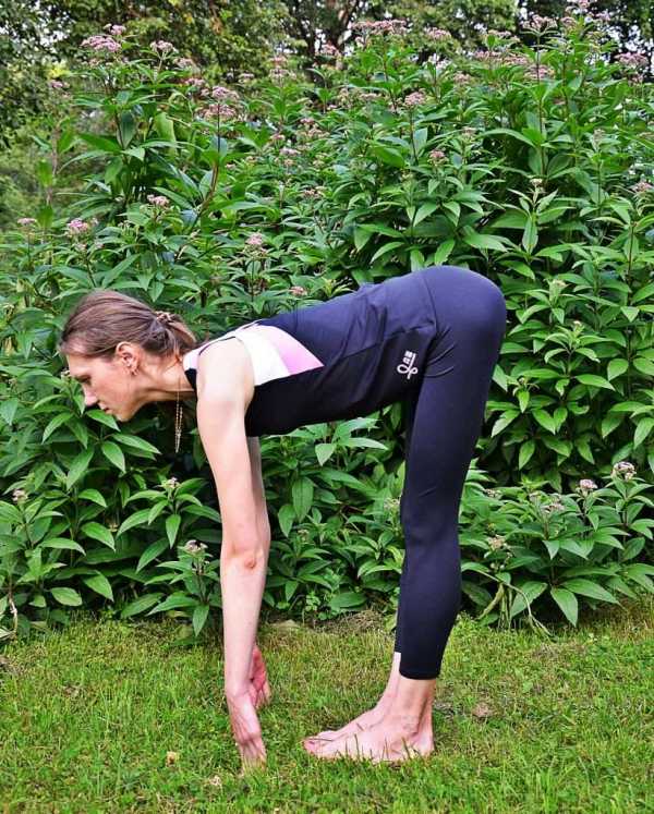 Встаньте в позу горы. Положите ладони на бедра. Слегка согните ноги в коленях. Медленно наклонитесь вперед. Вытяните руки и обхватите лодыжки или ноги под коленями. Не отрывая рук, выпрямите спину и ноги настолько, насколько позволяет ваш уровень гибкости. На вдохе, не отрывая рук, тянитесь вверх, расправляя плечи и напрягая спину. На выдохе наклоняйтесь, стараясь прижать голову к ногам. Спина расслаблена. После 6 выдоха медленно поднимитесь, раскрываясь, как цветок. Голова поднимается последней.