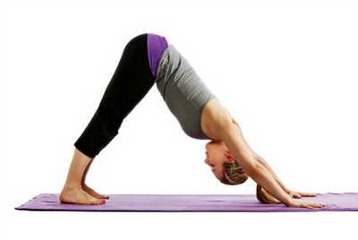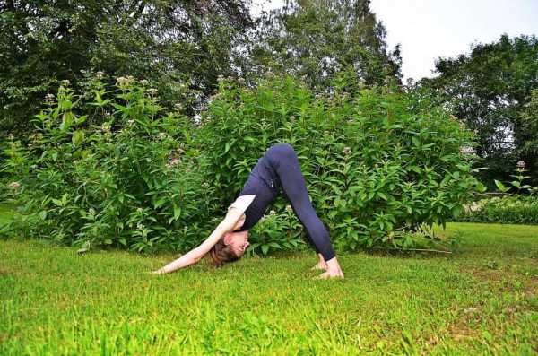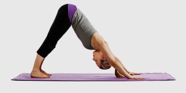 - «Собака мордой вниз» – растягивает мышцы ног, рук и спины. Для выполнения позы, держа ноги шире, поставьте ладони в пол на таком расстоянии, чтобы тело вместе с полом образовало треугольник. Обратите внимание, ноги не должны быть согнутыми, а руки со спиной вытягиваются в прямую линию. Взгляд направляйте на стопы, подбородок прижмите к груди. Держите позу 8-10 вдохов-выдохов.
