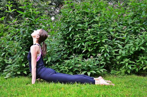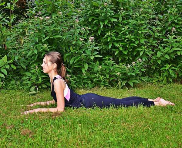 - Кобра. Нужно лечь на пол животом вниз, ладони под плечи. Оттолкнуться ладонями от пола, отвести плечи назад и направить взгляд на потолок. Спина прогибается таким образом, чтобы весь вес приходился на пупок. В таком положении задержитес на 5 вдохов и выдохов и повторите несколькко раз.