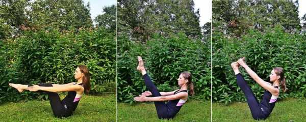 Лягте на живот, отведите руки назад. Ноги согните в коленях и поднимите. Ухватитесь руками за лодыжки, максимально напрягите пресс. Держите асану 30-40 секунд.
