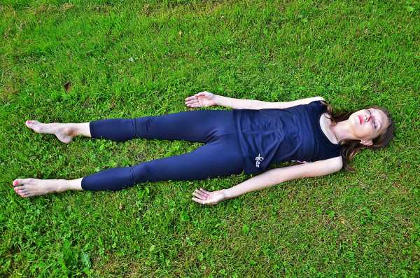 Из позы ребенка вытяните ноги, занимая позицию лежа. Перевернитесь на спину. Пусть ноги и руки лежат свободно. Закройте глаза и насладитесь тишиной (или музыкой). Полежите так минут 10, ни о чем не думая.