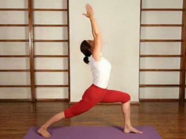 Для выхода втяните живот, разведите ноги на ширину плеч. Сделайте шаг вперед, согните колено; угол должен быть прямым. Руки разведите в стороны, а потом поднимите максимально вверх, соединяя над головой. По 30 секунд на каждую ногу.