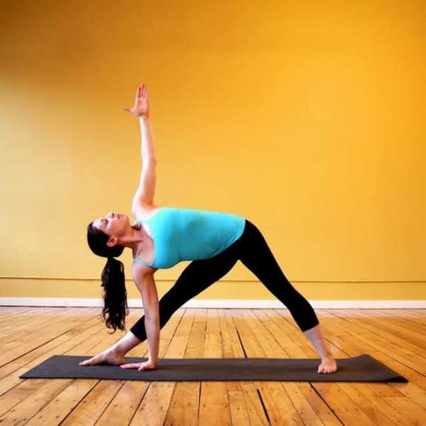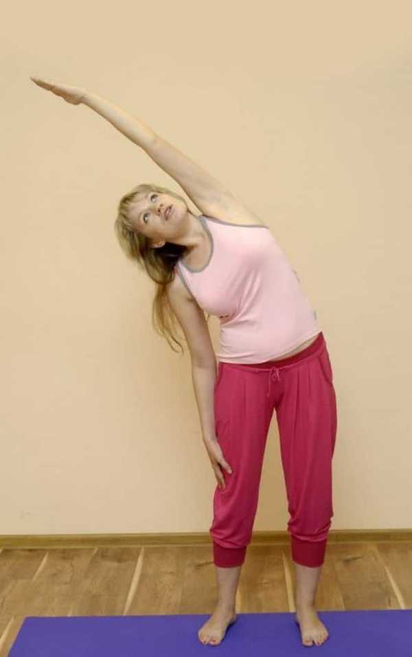 Начните с того же исходного положения, что и в предыдущих асанах, потом поднимите одну руку вверх, вытяните ее и наклоняйтесь к противоположной ноге. Вторую руку не напрягайте. Дышите глубоко, держите асану 40 секунд. При этом смотрите на пальцы руки, которая над головой. Сделайте асану в другую сторону.