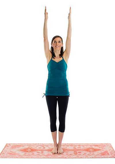 - Вариация позы горы. Следует встать ровно и поднять руки над головой. Взгляд направлен прямо. Такое положение удерживается несколько минут. Здесь важно тянуть лопатки вниз, руки напряжены и вытянуты, колени мягкие.