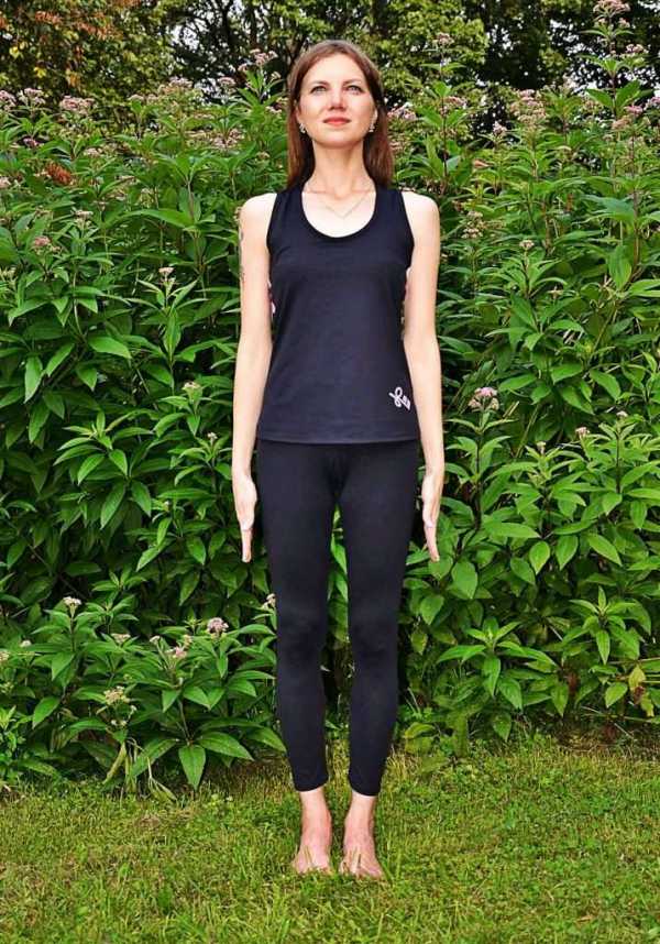 На первый взгляд может показаться, что это просто положение стоя, но это не так. Чтобы приступить к йоге, вам, в первую очередь, нужно научиться правильно стоять. Для входа в Тадасану нужно: соединить стопы вместе, подтянуть колени, ягодицы и живот, вытянуть позвоночник, расправить грудную клетку и опустить плечи, взгляд направить вперед, руки вытянуть, пальцами стремиться вниз.