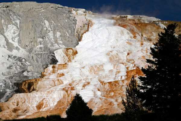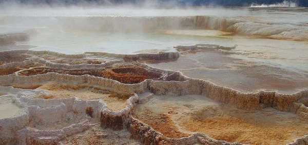 Одно из потрясающих геологических явлений Йеллоустоуна можно наблюдать у Мамонтовых горячих ключей: серебристые известняковые уступы подрастают ежедневно — вы можете это видеть. Горячие источники выбрасывают богатую солями воду из-под известняковых пород, откладывая свое содержимое в запрудах на самих уступах, откуда ежедневно оседает почти 2 тонны известкового туфа.