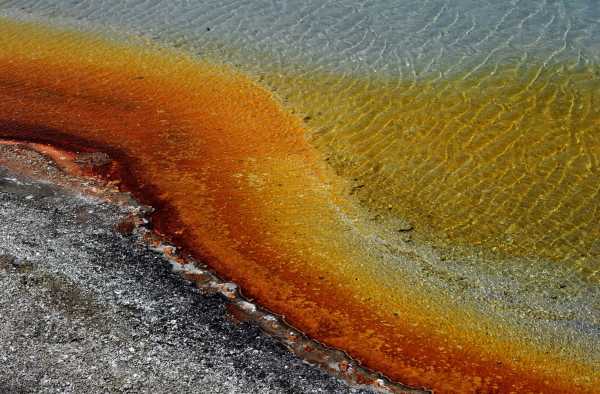 Горячий источник Сансет Лэйк (Sunset Lake), светящийся разноцветными красками от бактерий thermophiles, которые окрашивают источник в бирюзовые и зеленовато-коричневые тона.