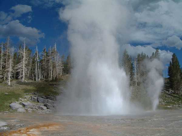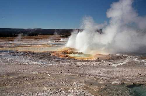 Главной достопримечательностью Йеллоустонского парка являются горячие источники и гейзеры, в том числе самым крупным гейзером Эксельсиор. Столб кипятка и пара этого гейзера с оглушительным ревом вырывается из озера. Вода поднимается на высоту более 100 метров, а пар поднимается еще выше – до 300 метров. Как неожиданно появляется грохот и столб кипятка, так и внезапно исчезает. Самым популярным у туристов гейзером является Старый служака. Этот гейзер отличается от других тем, что с высокой точностью каждые 65 минут извергает на пятидесяти метровую высоту поток кипятка. Извергаясь пять минут, гейзер затухает для того что бы ровно через 65 минут показать свой буйный нрав.
